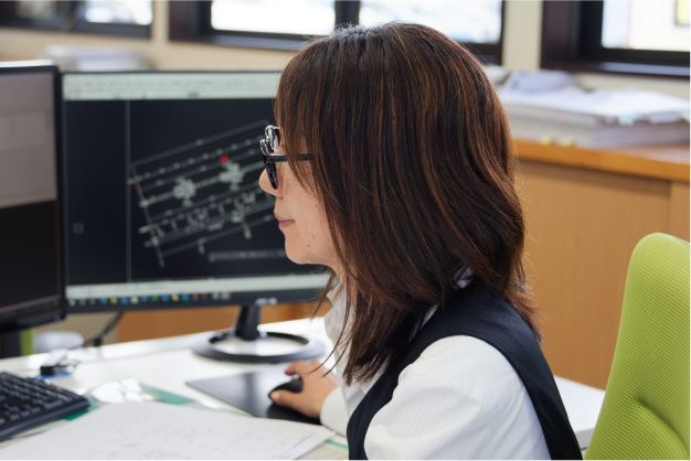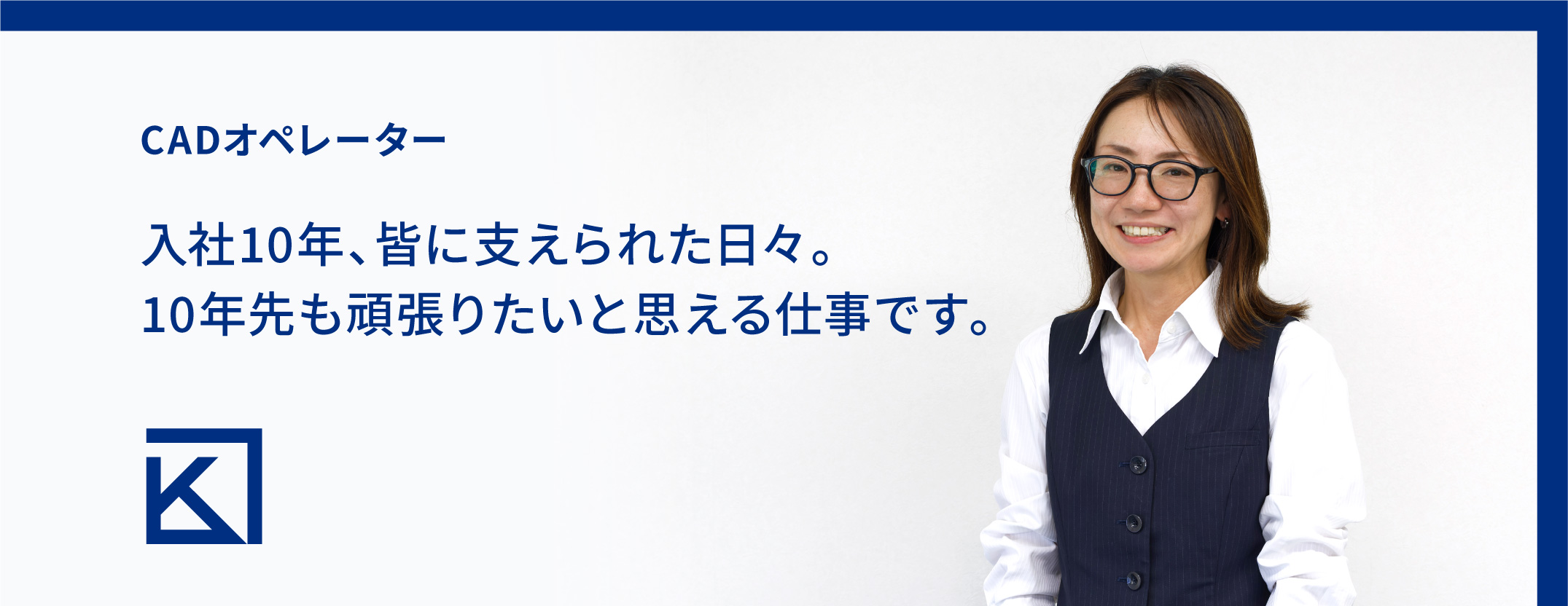 前職では、司法書士土地家屋検査士の補助員の仕事をしていましたが、子供が病気がちで仕事を続けることが困難になりました。そんな時、ご紹介いただいたのが片桐建鋼でした。CADオペレーターといっても色々な業種があり、鉄鋼製品の図面作成は初めてで、最初は不安と苦労の連続でした。でも、楽しい社員の皆さんや上司に支えられ、日々勉強しながら乗り越え、今に至っています。