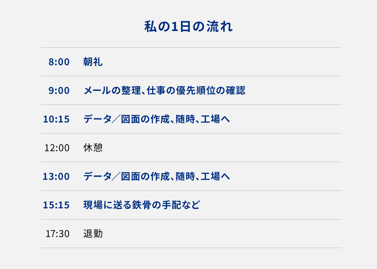 PL、孔開け、H鋼など鋼材の切断データや鉄骨製品の図面を、工場のスタッフが製作しやすいようにするため、CADでデータを作っています。難しい図面だと寸法をいれても分かりづらく、工場の製作スタッフに上手く伝わらない場合もありますが、上司と相談したり、制作スタッフと何度も打ち合わせをして乗り越えられた時は、大きな達成感を感じます。難しい仕事ですが、全員で一丸となり製作した製品がトレーラーに乗り、現場に搬入される時には「みんなで頑張った!」というやりがいと満足感で満たされています。